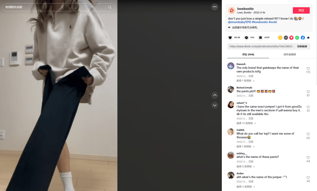 正在TikTok上具有17。09万粉丝的达人moonbaby1010,即是合做达人之一,她发布试穿Love, Bonito品牌新品上衣、裤子的展现视频,颠末时间发酵,目前正在TikTok上获得了320万的播放量和4。93万的点赞量,为品牌带来了不错的流量。